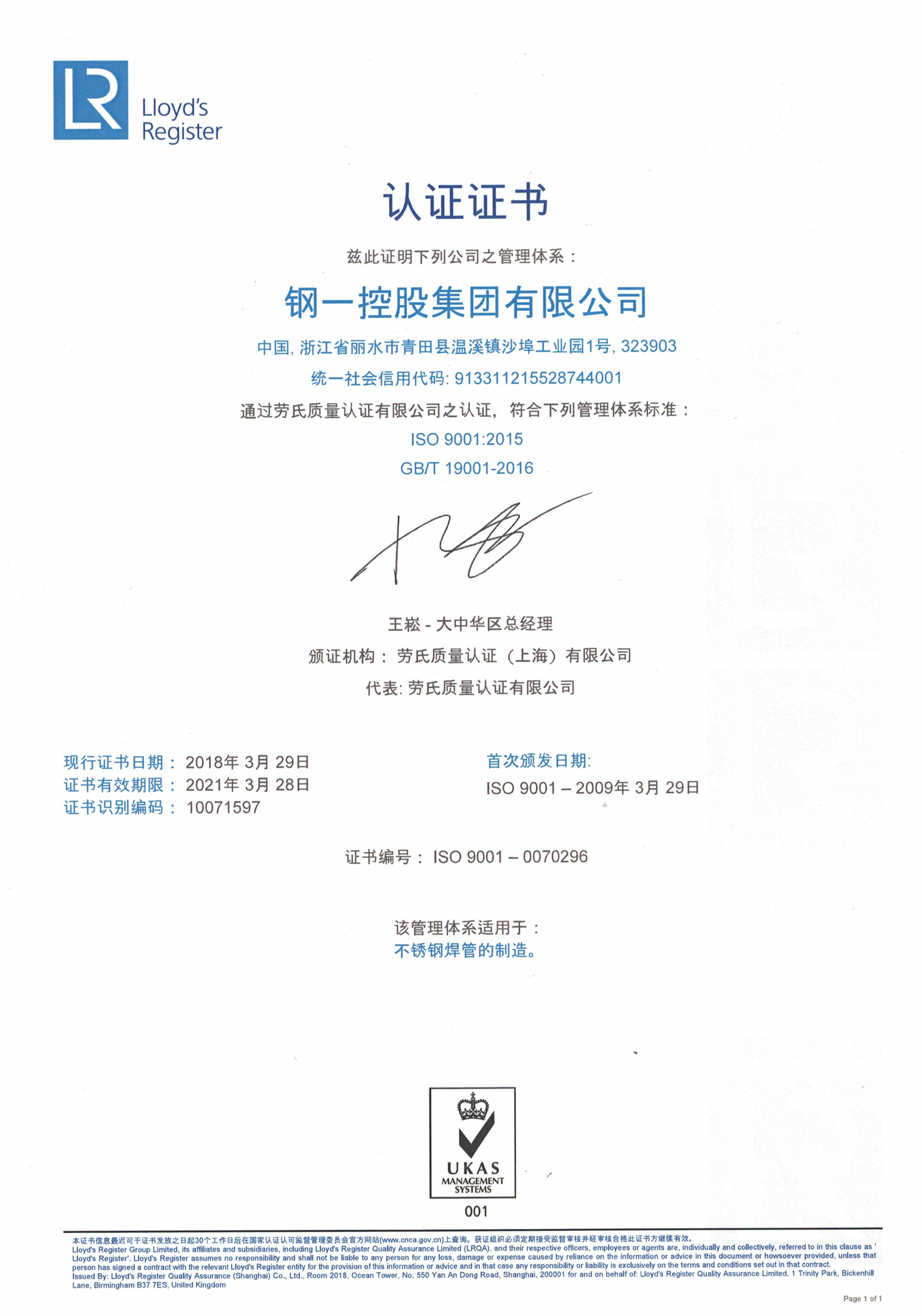 ISO 9001質量管理體系認證證書